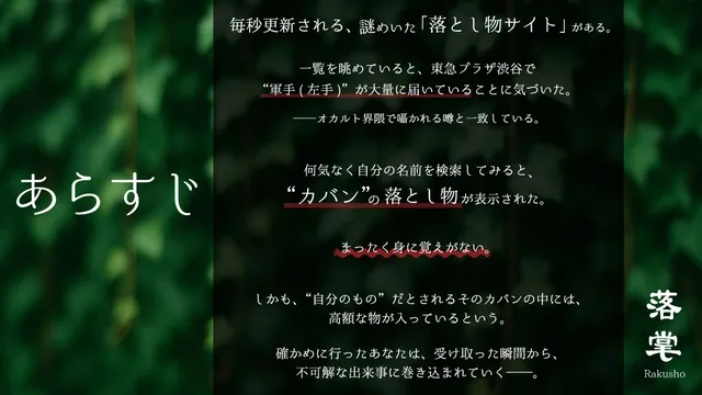 しかし、それを受け取った瞬間から、あなたは不可解な出来事に巻き込まれていくことになる。