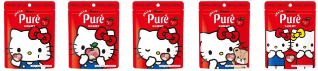 パッケージは、レトロかわいい雑貨のような全5種類のデザインが用意されており、ピュレグミを頬張るハローキティや、双子の妹ミミィと並んだ姿などが描かれている。