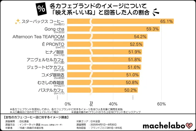 写真映えする「映え」のイメージでは、『スターバックス』(65.1%)がトップ。