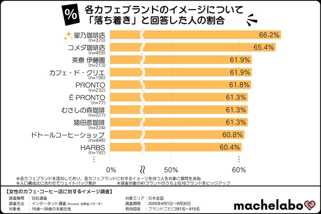 会話をじっくり楽しみたい「落ち着き」のイメージでは、『星乃珈琲店』(66.2%)が『コメダ珈琲店』(65.4%)を僅差で上回った。