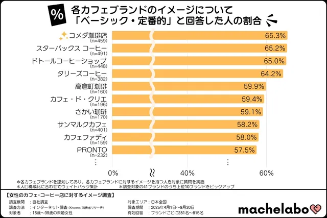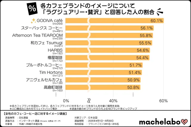 特別な日を演出する「贅沢さ」では、『GODIVA café』(60.1%)が頭一つ抜け出し、安心感のある「定番」では、『コメダ珈琲店』『スターバックス』『ドトールコーヒーショップ』『タリーズコーヒー』の大手4ブランドが僅差で並ぶ結果に。