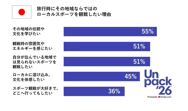 日本の旅行者では、「その地域の伝統や文化を学びたい」(55%)という動機が最も多く、スポーツ観戦を通じて地域コミュニティに触れたいという意向がうかがえる。