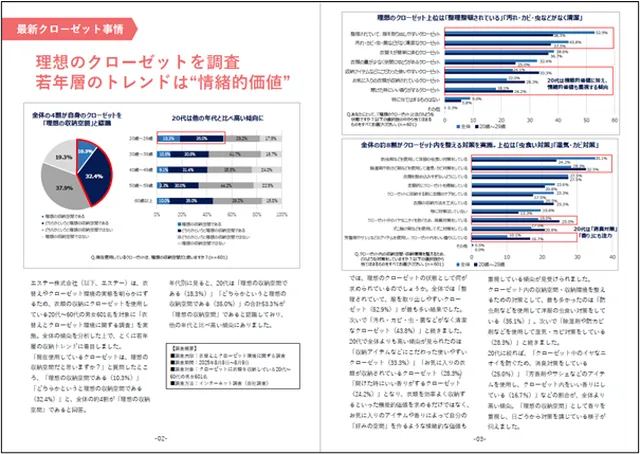 エステーが2025年10月に実施した調査によると、全体の約4割が自分のクローゼットを「理想の収納空間」と答えたそう。なかでも20代ではその割合が53.3%と高く、「お気に入りのアイテムが収納されている」「開けたときにいい香りがする」といった“情緒的価値”を求める傾向が際立っている。