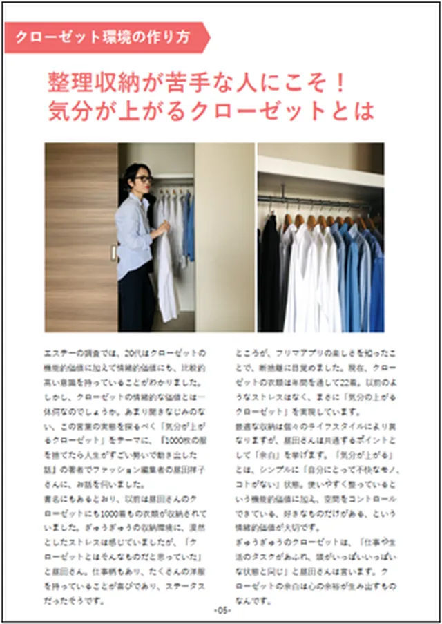 「エステー株式会社」が公開した新ガイドブック『気分が上がるクローゼットの作り方』は、収納を“感情の空間”として再定義する試みだ。香りやお気に入りのアイテムを組み合わせ、開けた瞬間に気分が上がるクローゼットをつくる──。その発想を監修したのは、ファッションエディターの昼田祥子氏。整えることを通して“自分の心地よさ”を知るためのガイドになっている。