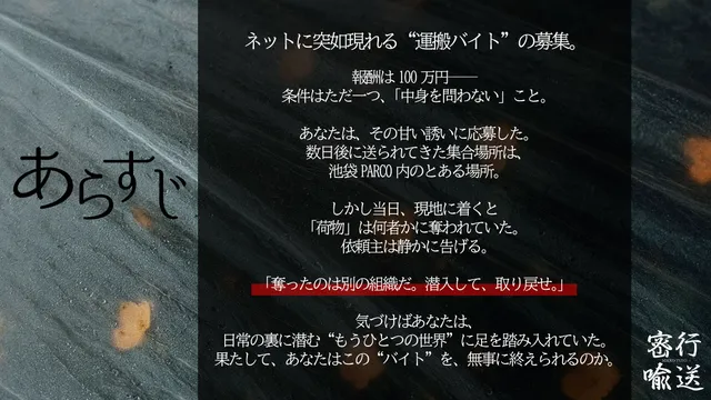 参加者は、報酬100万円の怪しげな「運搬バイト」に応募したという設定で、日常の裏に潜む“もうひとつの世界”に足を踏み入れることになる。