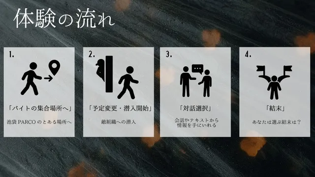 参加者は主人公として、商業施設内を周遊しながらキャストと一対一で対話し、情報を集めて謎を解き明かしていく。
