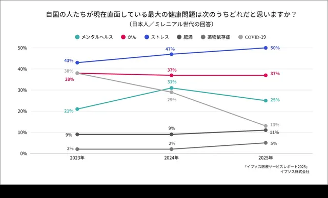 他の世代に目を向けると、ミレニアル世代とX世代では、依然として「ストレス」が最大の健康問題として認識されている。