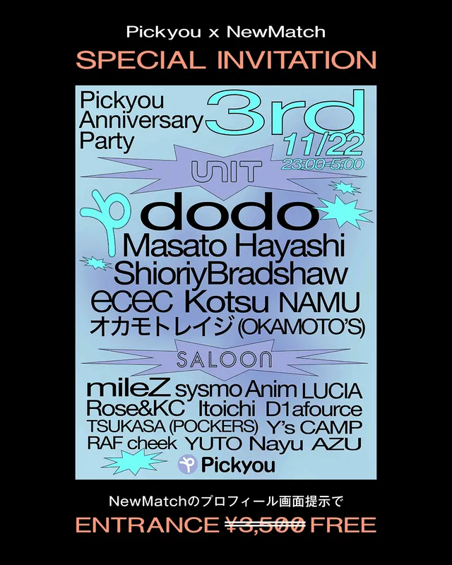 ONE株式会社が提供する『NewMatch』のプロフィール画面をイベント当日の受付で提示すると、通常3,500円のエントランス料金が無料になるとのこと。