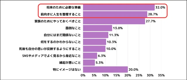同社の発表によると、20代および30代の若者が抱く終活のイメージとして、「将来のために必要な準備」や「前向きに人生を整理すること」といった回答が上位を占めたらしい。