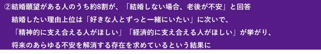 調査では結婚願望と老後への不安についても触れられている。結婚したいと回答した人のうち約8割が、結婚しなかった場合の老後に不安を感じているとのこと。