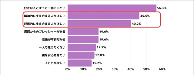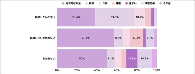 この結果から、将来的な孤独や経済的な懸念を解消する手段として結婚を捉えている側面があるかもしれない。