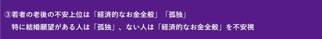 孤独や経済的な不安に対し、結婚や資産形成を通じて前向きに対処しようとする現代の若者像が見えてくる。