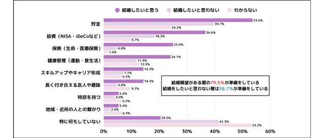 特に結婚願望がある層では約8割が対策を講じており、その内容は「貯金」や「投資」、「保険」などが中心となっているとのこと。将来を見据え、能動的に備えようとする姿勢がうかがえる。