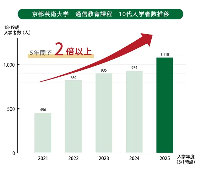 京都芸術大学通信教育課程は、10代の入学者が過去5年間で2.3倍に増加したと発表した。