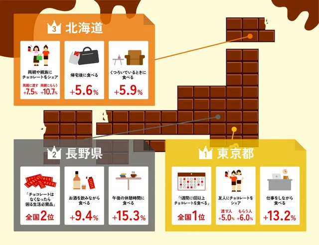 調査結果によると、チョコレート愛好度が最も高かったのは東京都で、次いで長野県、北海道という順になった。