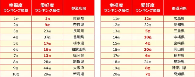 幸福度ランキングの上位20都道府県のうち13地域が、チョコレート愛好度でもトップ20にランクインしていたとのこと。明確な因果関係までは断定できないものの、両者に一定の相関がある可能性が示唆された。