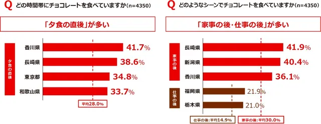 特に幸福度が高い地域では、「夕食後」や仕事・家事などの「労働後」にチョコレートを食べる傾向が見られたそうだ。