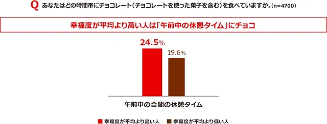 幸福度が高い人はそうでない人に比べ、「午前中の休憩時間」にチョコレートを食べる割合が高かったとのこと。