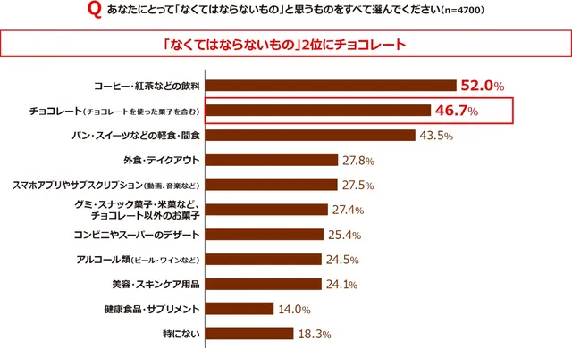 さらに、嗜好品の中で「なくてはならないもの」を問う設問では、コーヒー・紅茶に次いでチョコレートが2位に選ばれたそう。
