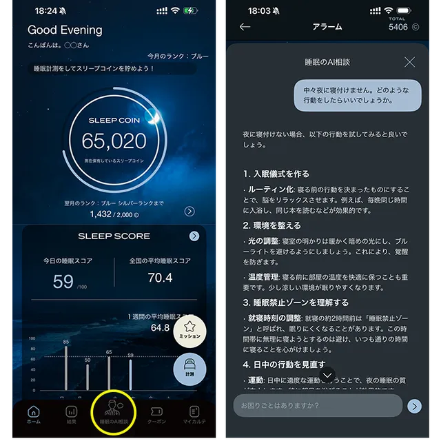 計測されたデータをもとに、日々の睡眠状態に合わせた改善提案を行うほか、睡眠習慣が良くなるほど「スリープコイン」が貯まる仕組みも導入している。