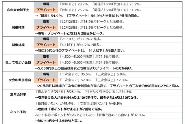 今年の忘年会への参加意向は、職場・プライベートともに半数を超えたという。