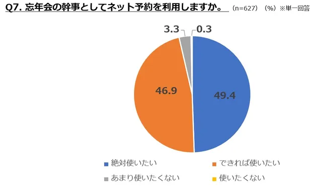 また、幹事としてのネット予約利用意向は96%に達しており、忘年会とネット予約は切り離せない関係にあるようだ。