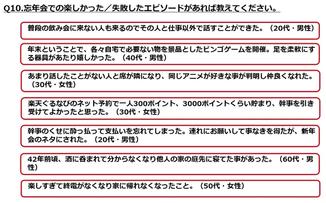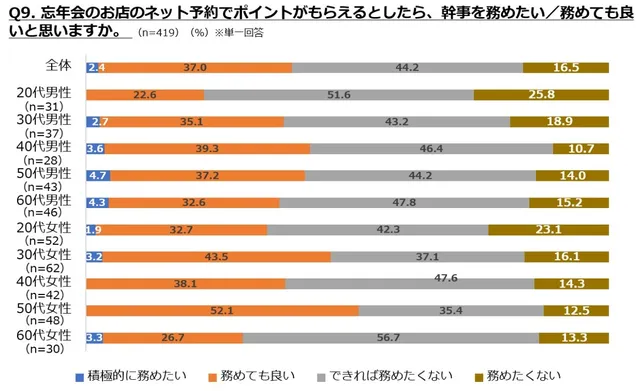 調査によると、忘年会の幹事を頼まれた際の対応について、全体では消極的な意見も見られたが、40代男性の35%、50代男性の33%が「喜んで引き受ける」と回答しており、比較的高い意欲を示している。