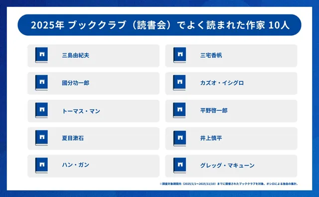 オシロ株式会社が、同社が提供するコミュニティプラットフォーム「OSIRO」上で行われた2025年のブッククラブ(読書会)の実績をもとに、よく読まれた作家10名を発表した。