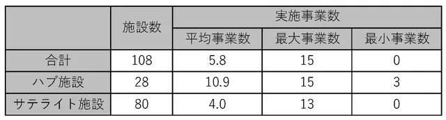 調査では、ハブ施設が平均10.9の事業を実施しているのに対し、サテライト施設は4.0事業にとどまるなど、機能差が明らかになった。