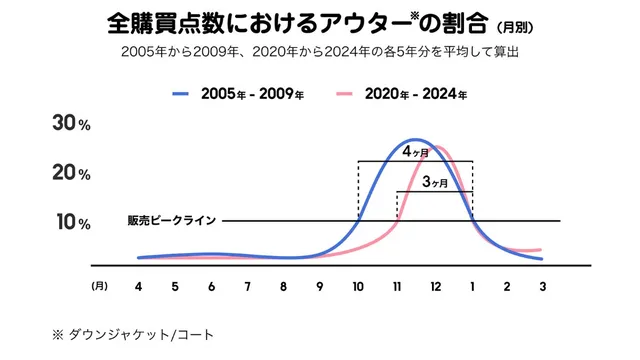 一方で、アウターの販売ピーク期間は約1ヶ月短縮しており、温暖化が購買行動に直接的な影響を及ぼしていることがデータから読み取れる。