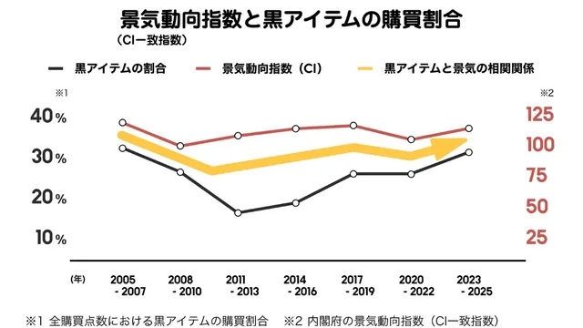 景気動向指数と黒アイテムの販売比率には連動性が見られ、好景気時にはシンプルで安定感のある黒が選ばれやすくなるのかもしれない。