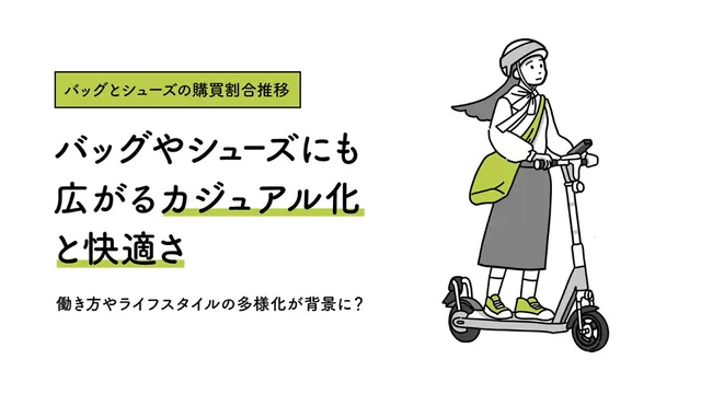 スマートフォンの普及により両手が空くショルダーバッグの人気が高まり、リモートワークやカジュアル通勤の定着でスニーカーやサンダルの需要が増加。