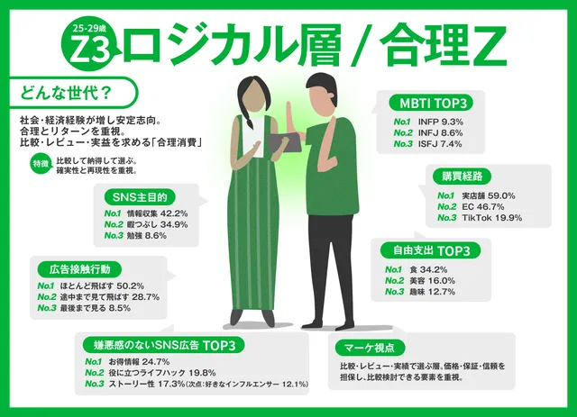 対照的に、Z3層(25〜29歳)はECサイトでの購入率が高く、Google検索などを活用して情報を比較検討する傾向が強い。コストパフォーマンスや機能を重視し、合理的な判断に基づいて商品を選ぶ「安定・堅実世代」としての特徴が浮かび上がった。