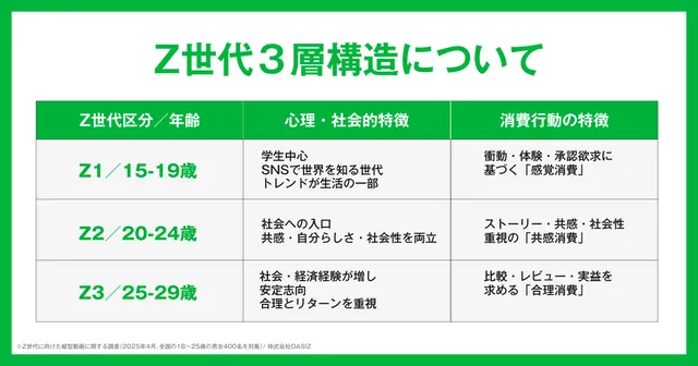 同社はZ世代を「Z1(15〜19歳)」「Z2(20〜24歳)」「Z3(25〜29歳)」の3層に分類し、それぞれの特徴を分析している。