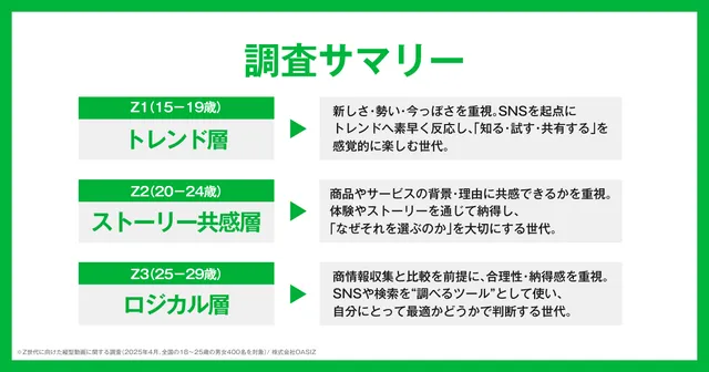 OASIZは、Z世代を一括りにするのではなく、各層の特性に合わせた「3層Z設計」によるマーケティングが重要であると提言している。ターゲットとなる層の心理や行動パターンを深く理解することが、効果的なコミュニケーションにつながるだろう。