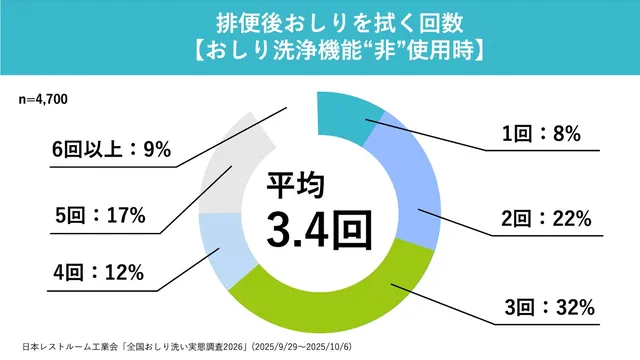 温水洗浄便座の使用者は、非使用者に比べて排便1回あたりの拭き取り回数が平均約1.3回少ない。これを生涯100年で換算すると、約4万7450回もの差になるという。