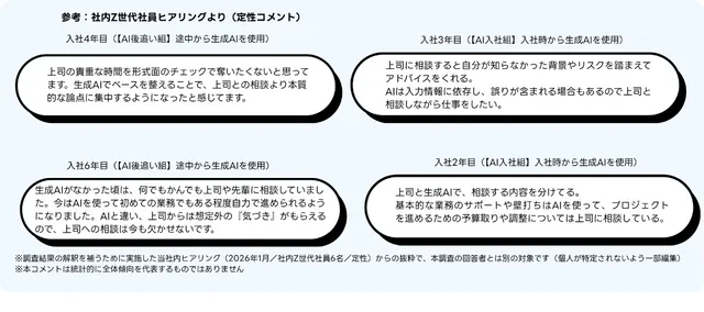 ・本調査は「勤務先に生成AIが導入されている環境で働く層」を対象としており、Z世代全体を代表する推計ではありません。
