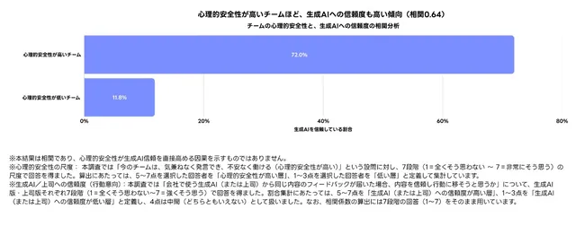 生成AIの活用度合いは、職場における心理的安全性とも密接に関連しており、同社の分析では、率直に意見を言える環境があるチームほど、AIからの助言を信頼して業務に取り入れる傾向が高まるのだそう。
