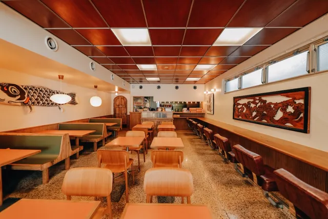 店内は日本とアメリカのミッドセンチュリーデザインを組み合わせた空間で、照明にはイサム・ノグチの作品を採用。