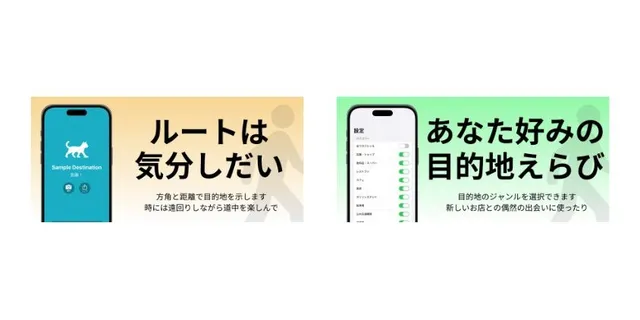 ユーザーは目的地のジャンルを選択できる仕組みも用意されており、街歩きや気ままな散策を楽しみたい人向けのアプリとして展開していく考えだ。